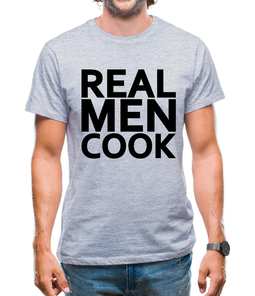 This Real Men Cook Mens T-Shirt is a 100% ringspun cotton, loose fit crewneck tee. Available in a great range of colours and sizes, it features a hard wearing & high quality print with our original 'Real Men Cook' design.