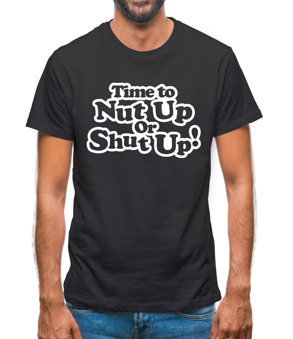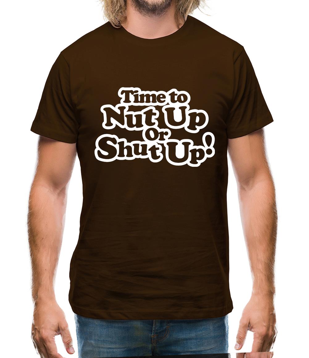 This Time To Nut Up Or Shut Up! Mens T-Shirt is a 100% ringspun cotton, loose fit crewneck tee. Available in a great range of colours and sizes, it features a hard wearing & high quality print with our original 'Time To Nut Up Or Shut Up!' design.